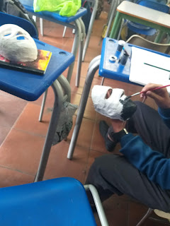 Este trabajo es elaborado por los estudiantes de grado 7, en el marco de trabajo en torno a identidad, buscan representar como son vistos, lo cual parte de una entrevista hecha a un familiar, un profesor y un amigo, las respuestas recogidas son representadas en colores, figuras y símbolos en la parte externa de la mascara, que es su propio resto elaborado en yeso.